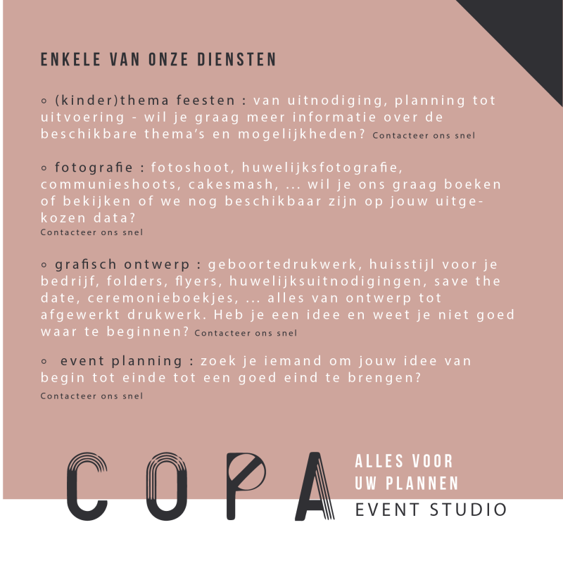grafisch design ◦ eventplanning ◦ verhuur ◦ drukwerk ◦ fotografie ◦ trouwbedankjes ◦ doopsuiker-bedankjes ◦ workshops